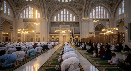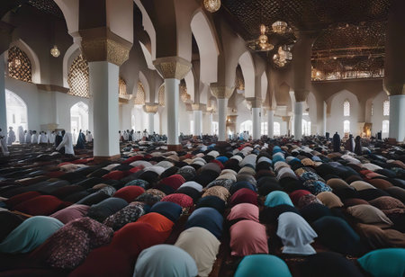 A large group of Muslims gather in a mosque for prayer, a serene and spiritual moment of unity and devotion. The image captures the essence of faith and the importance of community in Islam.