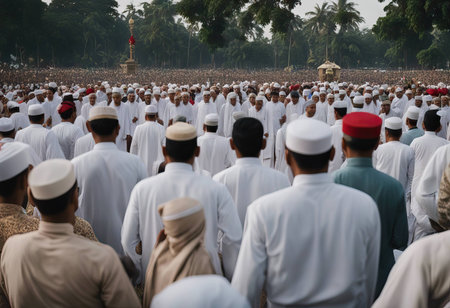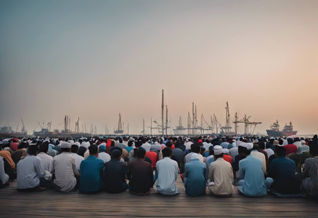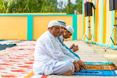 Bhairahawa, Nepal - June 5 2019: Asian Muslim devotees sitting in a row getting ready for Eid Prayers.