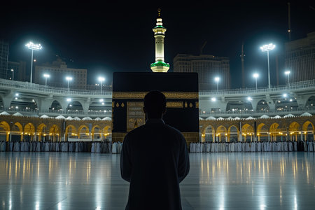 Pilgrim Stands in Awe of Illuminated Kaaba