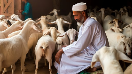 farm animal trade for eid adha sacrifice. man farmer and seller of goat and cow checking his goat