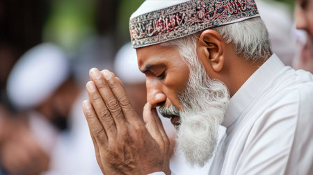 An elderly Muslim man with a white beard and traditional headwear is seen praying with his hands clasped together.