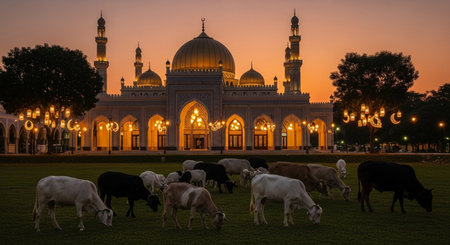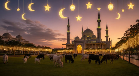 Ramadan Kareem background with mosque, crescent moon and sheep