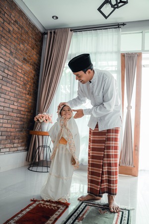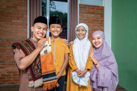 Portrait of the Indonesian Muslim family after Eid al-Fitr salat in front of the house. Concept of Happy Lebaran, Eid Al Fitr, Idul Fitri, and Ramadan Mubarak celebration