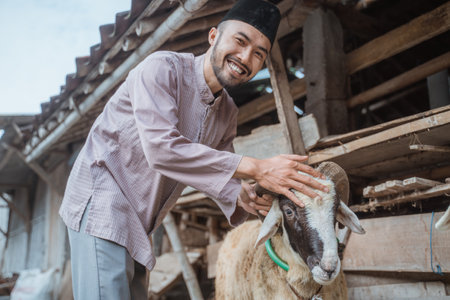 a moslem man with skullcap standing with smile and stroking the goats head that standing next to him