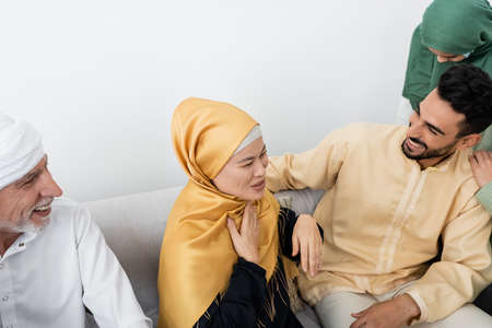 positive arabian man smiling near interracial muslim parents on sofa at home