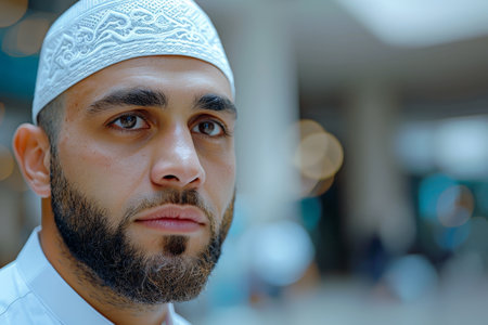 Close-up of a man wearing a traditional white cap, with a serious expression on his face. The background is blurred, highlighting his focused and contemplative meaning.