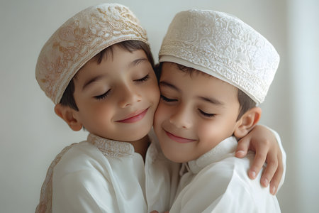 Two Muslim Boys Hugging Each Other and Smiling in Traditional White Clothes for Eid or Celebration