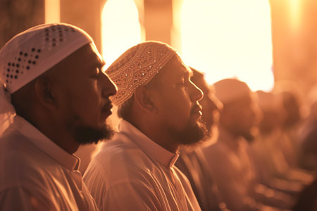Several Muslim men sit closely together, their long beards and white skullcaps distinct against a softly blurred backdrop, exuding a sense of contemplation and community.