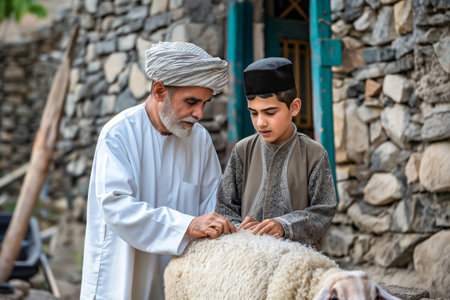 Muslim father teaching his young son how to prepare a sheep for the religious festival of eid al adha