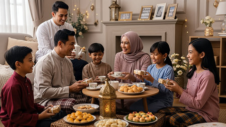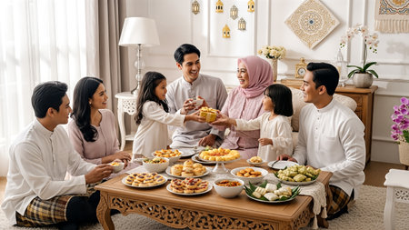 Group of Muslim family celebrating Eid al-Fitr together at home