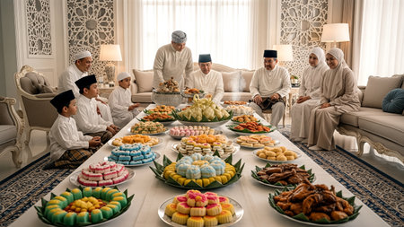 Islamic people around a festive table, celebrating Eid al-Adha with traditional dishes.