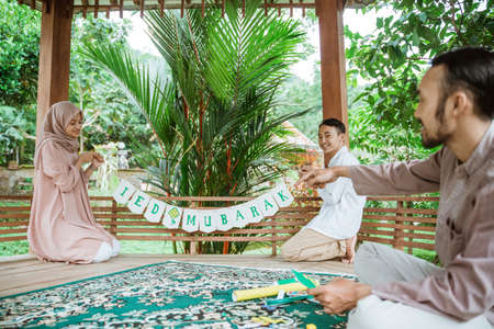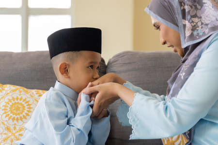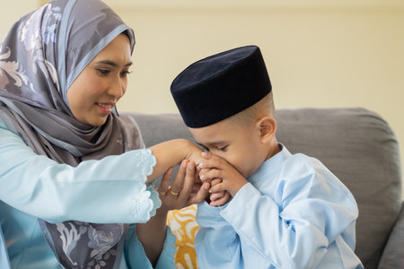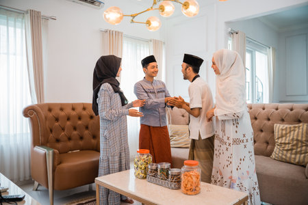 Asian Muslim families shake hand and forgiving each other during eid mubarak celebration at home