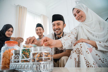 Muslim couple taking snacks from a jar during a visit to celebrate Eid at a friends house