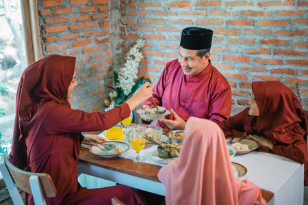 Happy Muslim family having iftar dinner during Ramadan dining table at home, sharing dates and smiling together.
