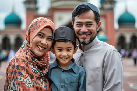 Joyful Southeast Asian Muslim Family at Grand Mosque