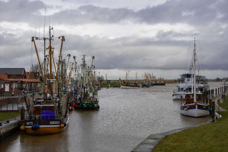 Greetsiel, Germany 12 March 2021, The harbor of Greetsiel with some fishing boats and dark clouds