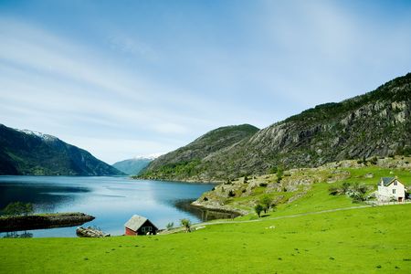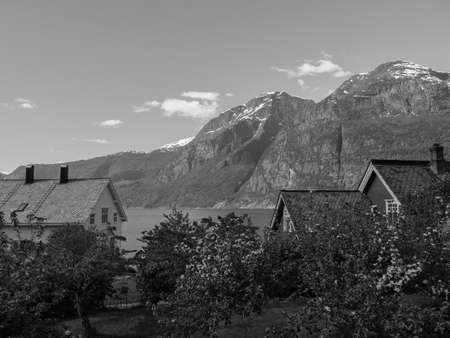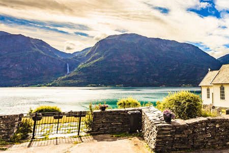 Norway scenery of Sognefjord with fields, houses, garden, mountains
