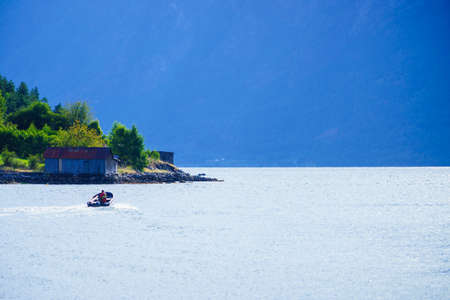 Solvorn village on fjord shore in Luster Municipality, Vestland county, Norway. Person ride in motor boat.