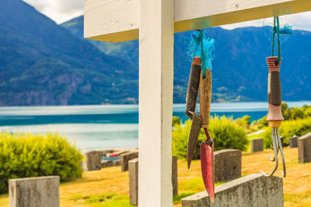 Norwegian churchyard in Nes village at fjord Lusterfjord, Vestland county, Norway. Tools supplies to take care of gravestones.