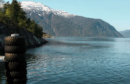 Ferry dock with big rubber tires for protection of ship in a fjord in Norway