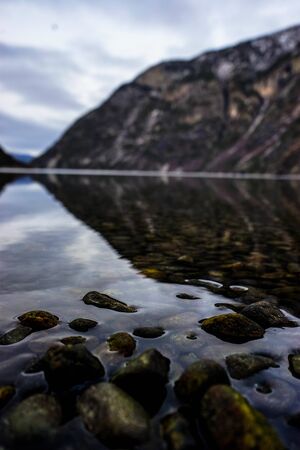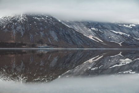End of fjord, Beautiful Norwegian landscape. view of the fjords. Norway ideal fjord reflection in clear water. selective focus