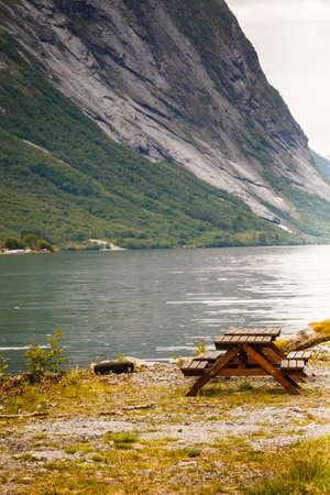 Picnic site table and benches with view at norwegian mountains and fjord, Scandinavia Europe.
