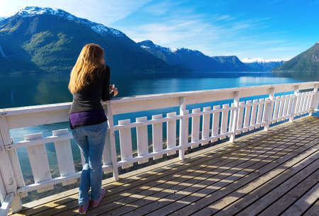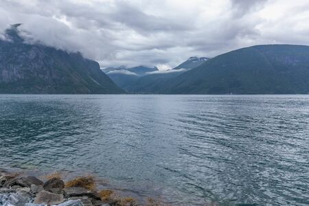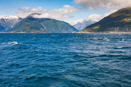 Tourism vacation and travel. Mountains landscape and fjord in Norway Scandinavia Europe. Norddalsfjorden as seen from ferry. Beautiful nature