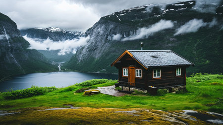 Captivating view of a tranquil fjord surrounded by majestic mountains and lush greenery, creating a serene atmosphere with mist and soft clouds.