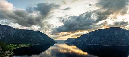 Panoramic view of end of fjord. Beautiful Norwegian landscape. view of the fjords with turquoise water. Norway ideal fjord reflection in clear water