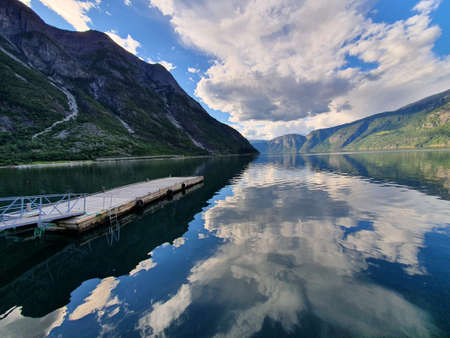 A view on the Songefjorden (King of the Fjords) from the water level. It is the deepest fjord in Norway. Tall, lush green mountains surrounding the fjord. Calm surface of the water. Clear blue sky.