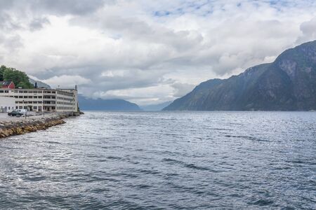 Mountains landscape and fjord route Vangsnes-Dragsvik in Norway, Scandinavia Europe. Sognefjord as seen from ferry. Tourism vacation and travel.