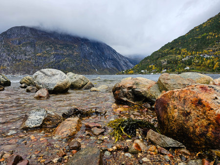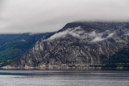 Views of the fjords, forests and mountains in cloudy weather in Norway