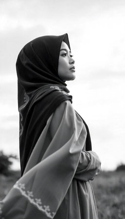 young girl with arabic veil to cover her head by the sea points away with black and white effect