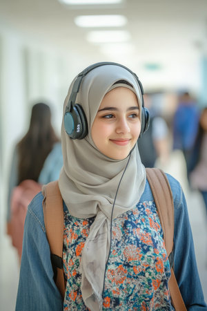An Arabian female student, wearing a hijab and modern school attire, is walking through the hallway with her headphones on. She is enjoying her music, smiling gently, as she moves confidently through the school corridor filled with students.