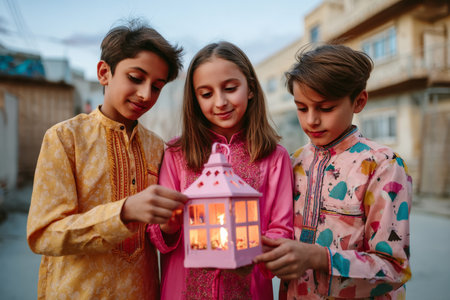Group of children dressed in festive clothes holding a glowing pink lantern during Ramadan at sunset, capturing the joy of traditional celebrations in a residential neighborhood.