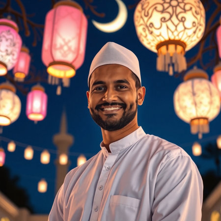 Handsome young Muslim man in traditional clothes holding lanterns at night