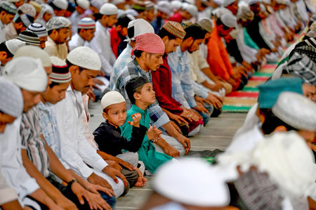 Bhairahawa, Nepal - June 5 2019: Asian Muslim devotees sitting in a row getting ready for Eid Prayers.