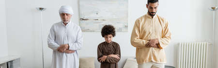 Muslim big family dressed in finest attire prays together at home. Members bow heads in prayer with voices rising in unison seeking blessings