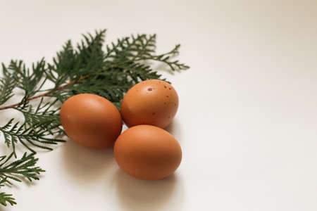 Raw organic farm eggs. Served on white background with copy space. Selective focus image.