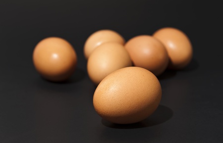 Five brown and white eggs with a hard shadow. They're in the corner of the box. Concept.