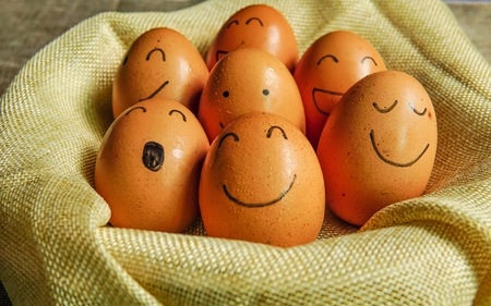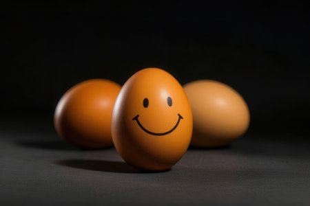 Close-up of eggs with cheerful smiles drawn on them, symbolizing a happier, better life. The playful designs add a touch of joy to the breakfast table.