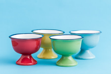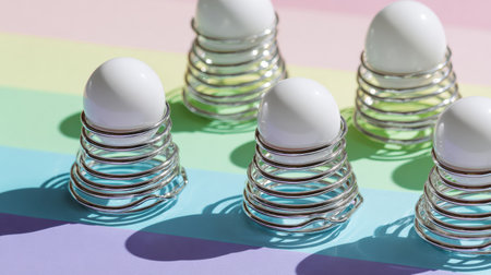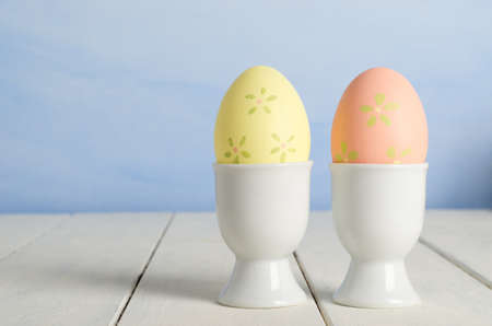 Eggs standing on egg cup on blue and pink pastel background, copy space. Boiled eggs in stand on paper background with two tone color. Healthy food concept. Easter eggs