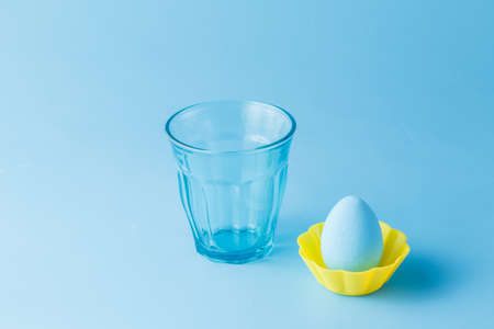 Single white egg sits in a white egg cup against a vibrant light blue backdrop, creating a simple yet visually appealing composition with a focus on breakfast and healthy eating, easter