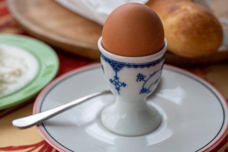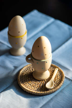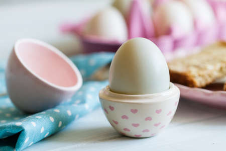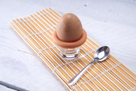 Boiled organic chicken egg in ceramic cup or holder on wooden table
