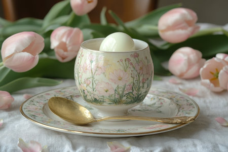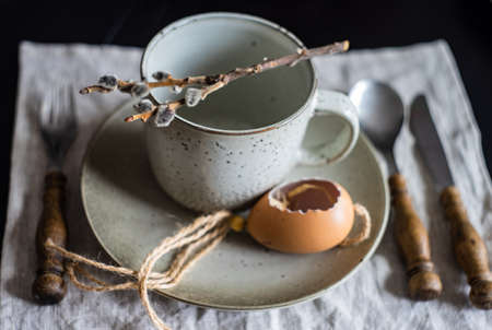 Tenderness Easter decoration with eggs and cup. vintage French-style photography with soft focus edges, subtle grain