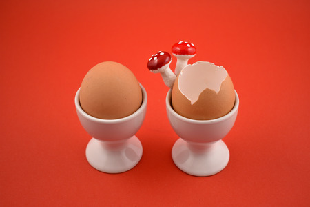 Egg decoration stock images. Funny Easter Egg. Easter egg with toadstool. Easter eggs on a red background. Spring decoration images. Breakfast still life