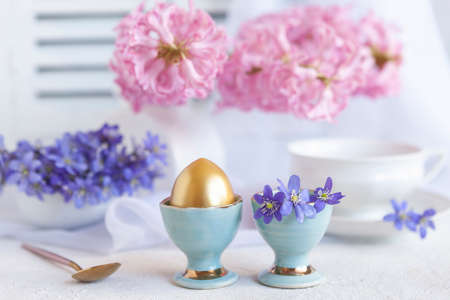 Fresh bouquet of delicate spring flowers liverwort Hepatica Nobilis and a golden egg in an egg stand - breakfast for Easter morning