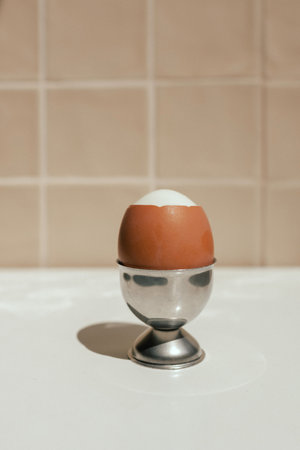 A beautifully smooth brown egg sits gracefully in a sleek, modern egg cup, creating a serene and minimalist aesthetic. The soft lighting highlights the eggs texture, evoking a sense of simplicity and elegance in everyday moments.