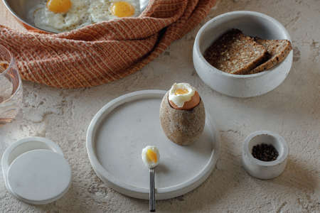 Fried two eggs in copper pan, hard boiled egg in stoneware egg cup, salt flakes, pepper, whole grain rye bread in concrete bowl on rough textured clay background. Healthy breakfast concept.