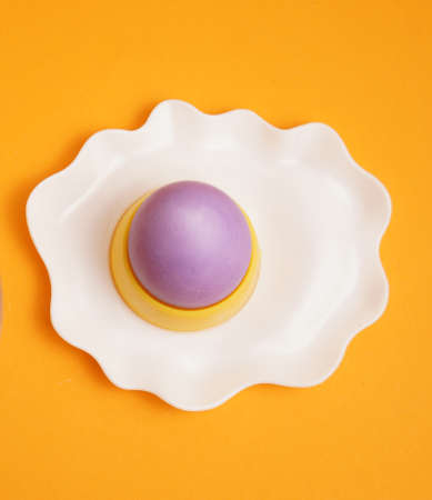 Happy Easter. Purple egg on an egg stand. Breakfast. Orange background.